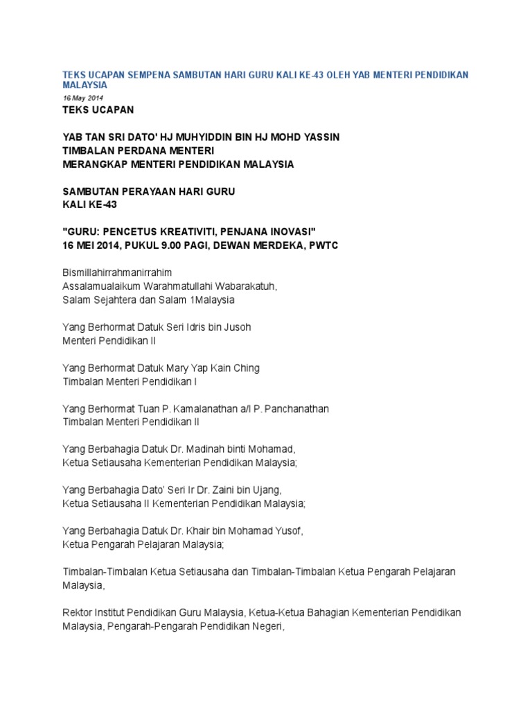 Teks Ucapan Sempena Sambutan Hari Guru Kali Ke 43 Oleh Yab Menteri Pendidikan Malaysia