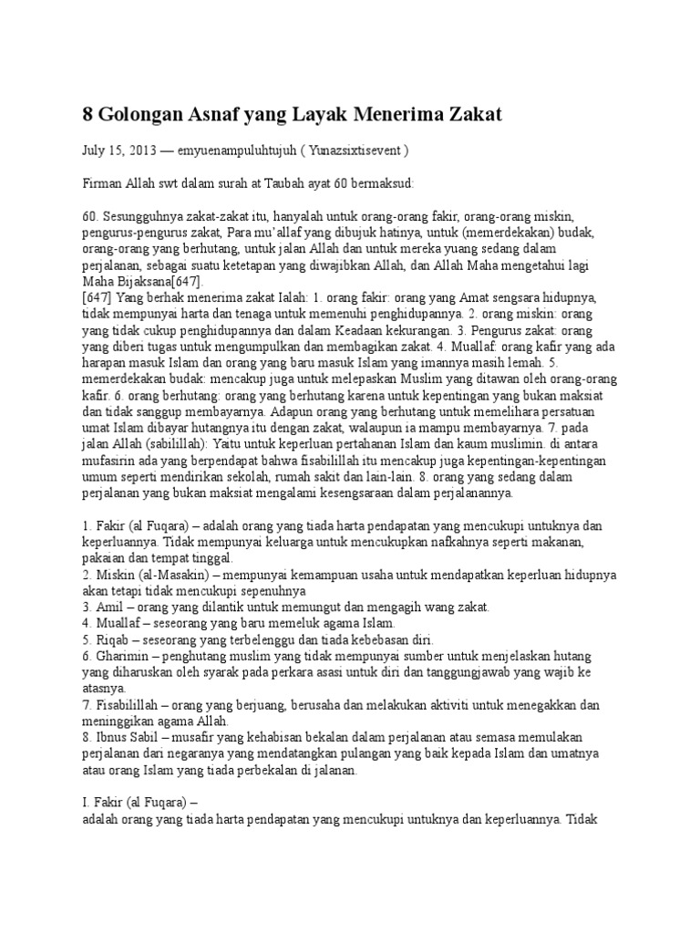 Bahagian Zakat Fitrah Muis 8 Golongan Asnaf Yang Layak Menerima Wang Zakat Firman Allah Swt Dalam Surah At Taubah Ayat 60 Bermaksud Sesungguhnya Sedekah Sedekah Zakat Itu Hanya Untuk Orang Orang Fakir