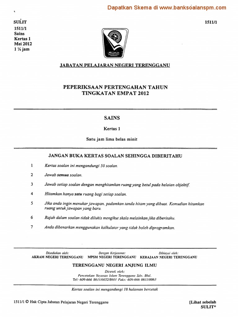 Sains Kertas 1 Ting 4 Pertengahan Tahun 2012 Terengganu