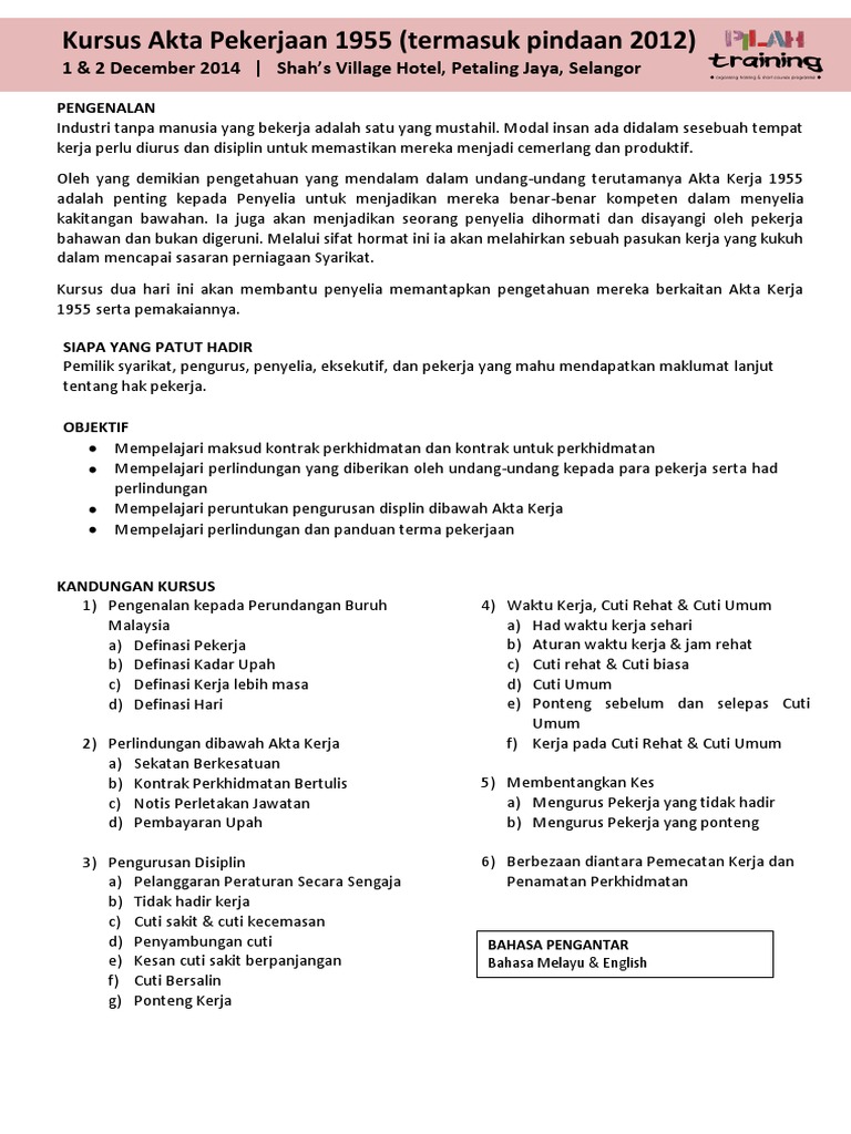 Kursus Akta Pekerjaan 1955 Termasuk Pindaan 2012 Manajemen Sumber Daya Manusia Malaysia